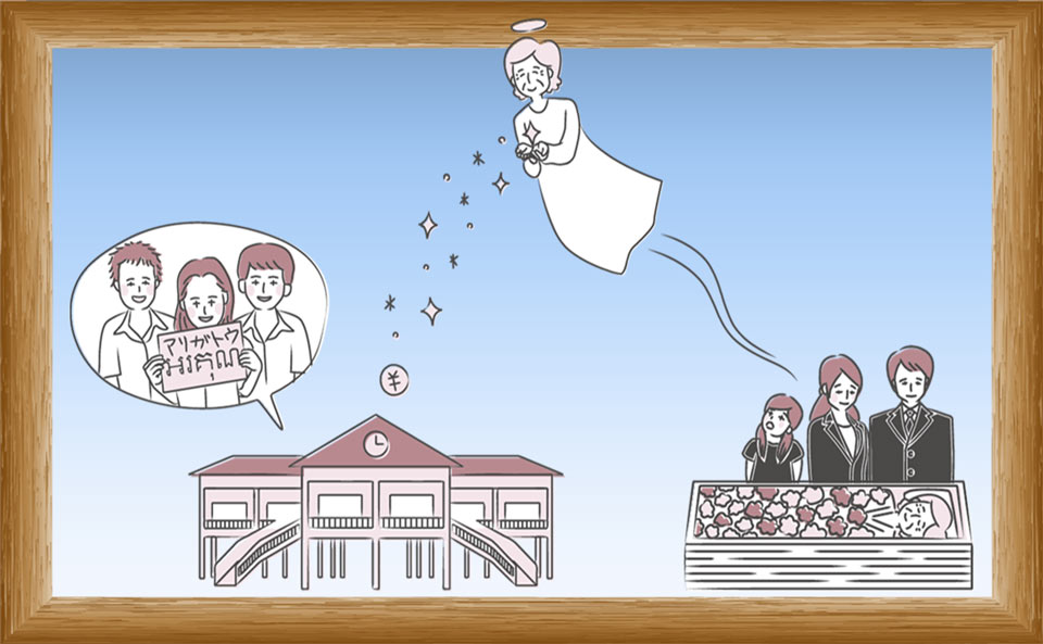 大切な家族のお葬式をきっかけに、子供たちが学ぶ校舎が建ちます。カンボジアの子供たちが学ぶ=「未来の命を繋ぐ」と同じことを意味します。